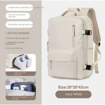 Features: Wet and dry separation bag, independent shoe position, USB interface, constant temperature side bag, breathable sponge back pad, side bag buckle, independent computer compartment